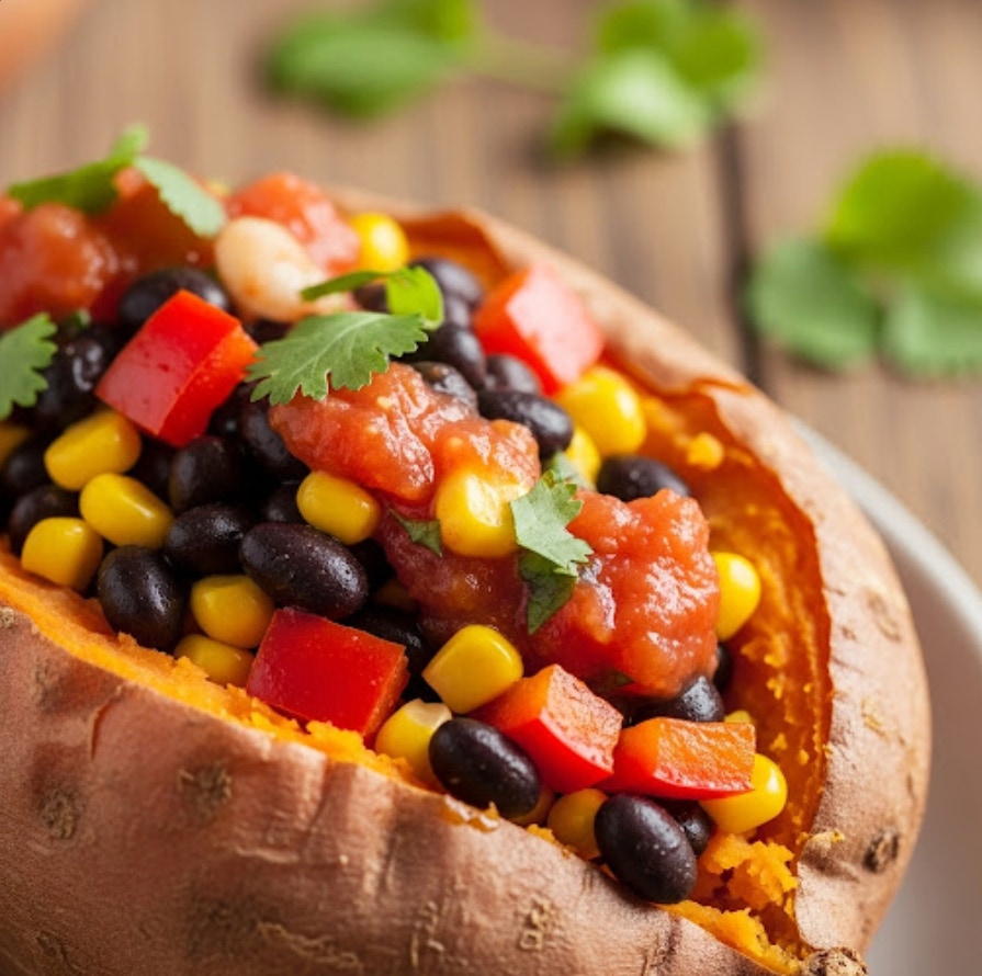 4. Füllen & Servieren: Die Bohnen-Mais-Mischung in die Süßkartoffeln füllen. Mit Salsa toppen und optional mit frischen Korianderblättern und Limettenspalten servieren.