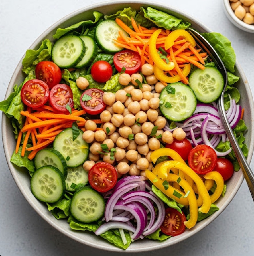 Dieser Salat ist ein echter Alleskönner: Er ist ruckzuck zubereitet, steckt voller gesunder Zutaten und schmeckt einfach fantastisch. Die Kombination aus knackigem Gemüse und cremigen Kichererbsen macht ihn zu einem perfekten leichten Mittag- oder Abendessen.