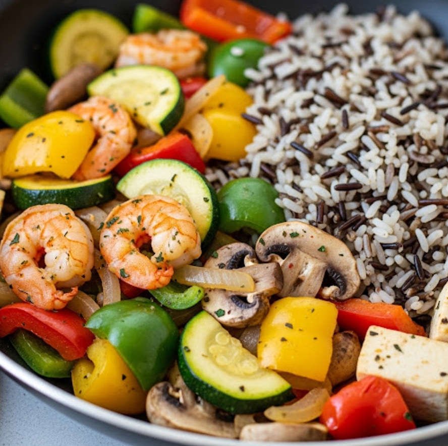 Gemischte Gemüsepfanne mit Tofu oder Garnelen und Wildreis: Schnell, gesund und superlecker!