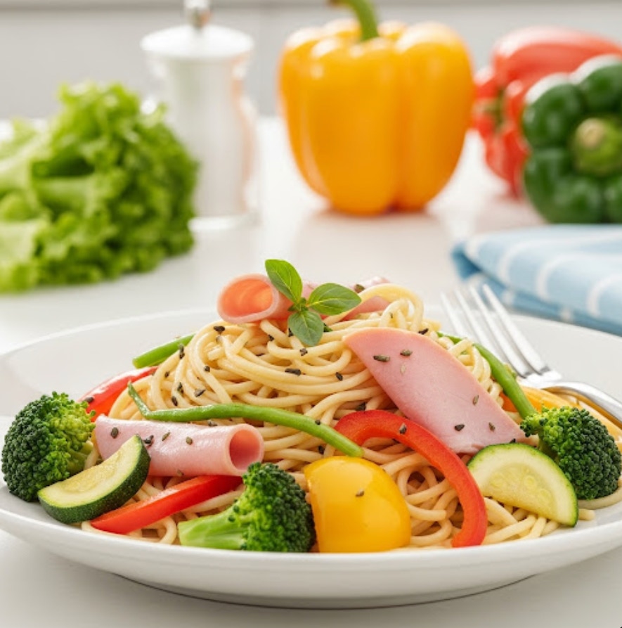 Kalorienarme Schinkennudeln mit viel Gemüse