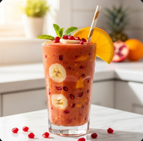 Sonnige Energie im Glas: Dein Smoothie mit Granatapfel, Orange & Banane!