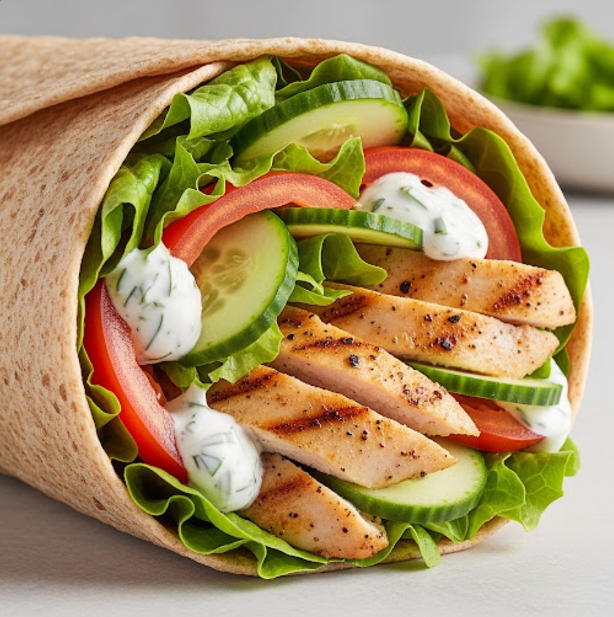 Großer Vollkorn-Wrap mit Hähnchen und Joghurt-Kräuter-Soße: Schnell, gesund und superlecker!